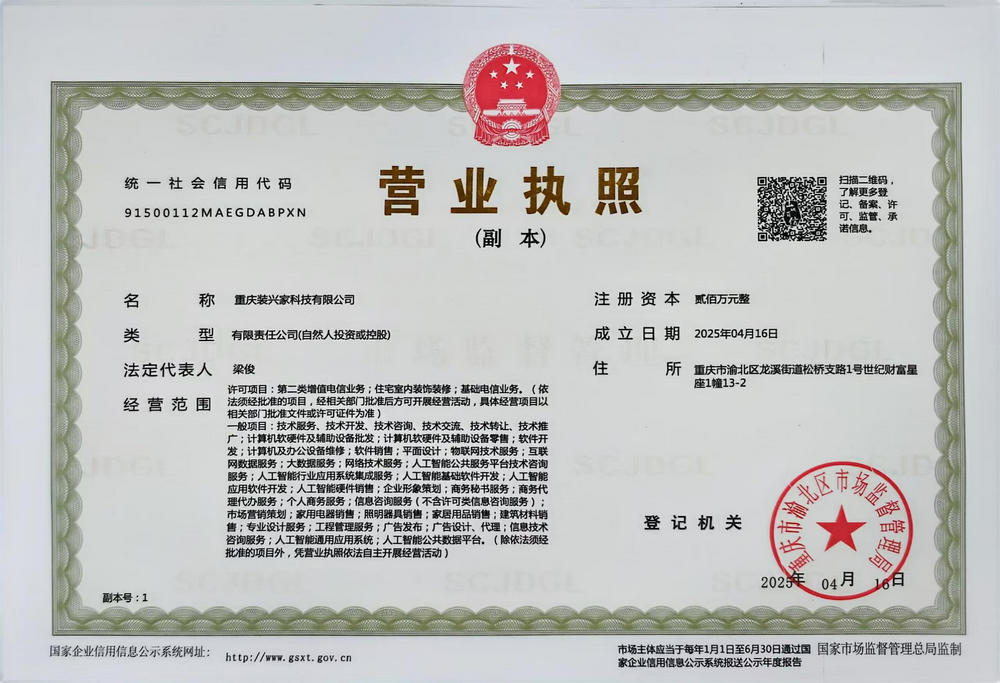 重庆装兴家科技有限公司(品牌名:兴家网)总部位于中国西部经济中心重庆,是2025年诞生的人工智能领域创新型科技企业。公司以"打造中国领先的智装服务平台"为企业使命,致力于链接装企与业主在人工智能时代下的新范式。